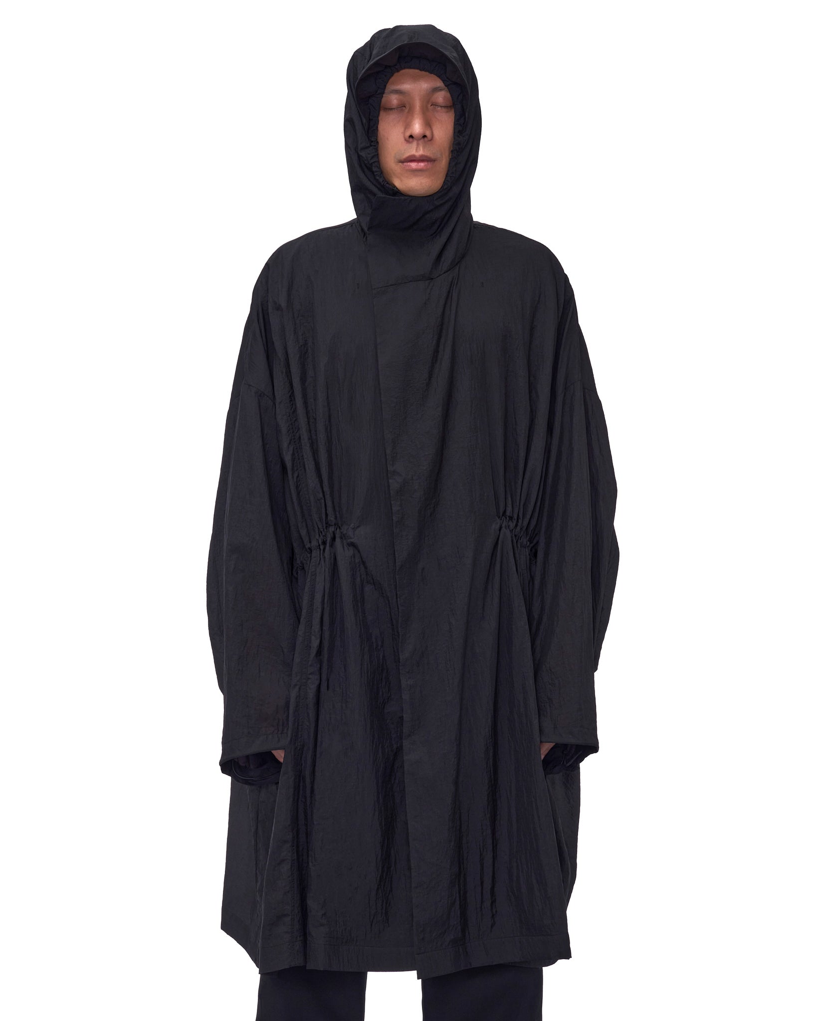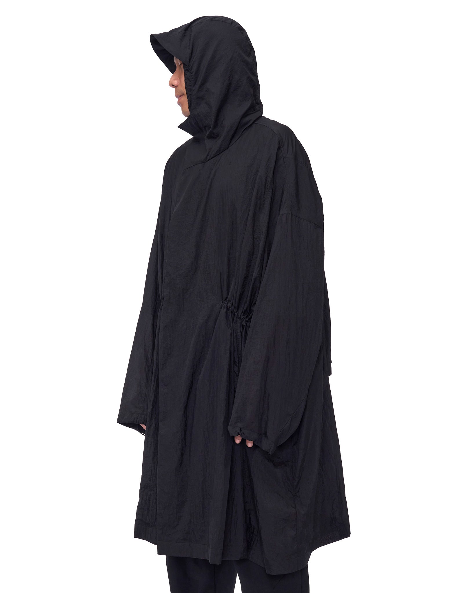 OVERSIZED HOODED PARKA IN ULTRA-LIGHTWEIGHT NYLON, DESIGNED TO BE PACKABLE INTO A FLIGHT NECK PILLOW FOR TRAVEL-READY AT THE WAIST, HOOD, AND CUFFS FOR A CUSTOM FIT. A STORM FLAP AT THE BACK BODICE ADDS A NOD TO CLASSIC TRENCH CONSTRUCTION WHILE ENHANCING BREATHABILITY. FINISHED WITH TWO FRONT POCKETS POSITIONED BELOW THE WAIST.