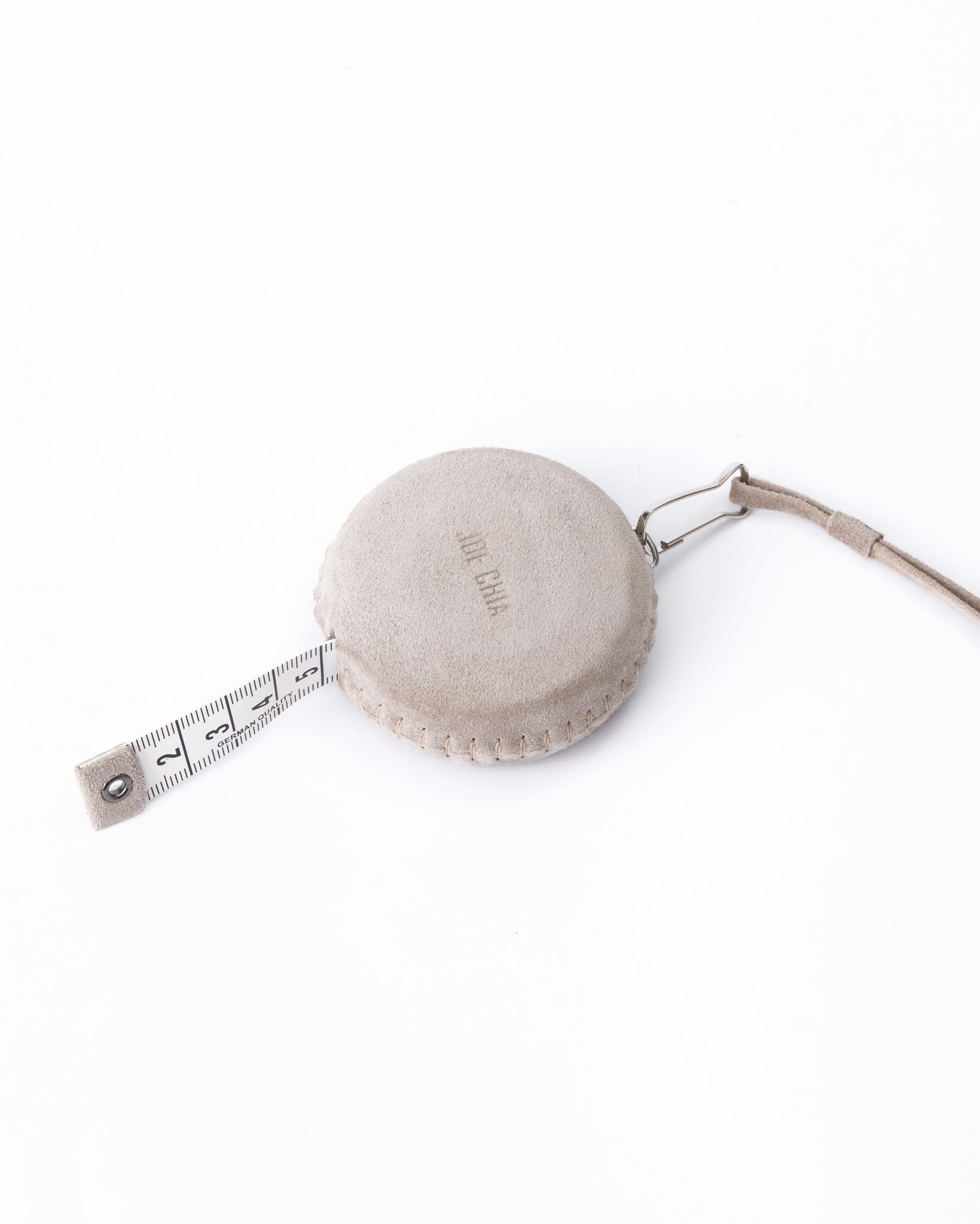RETRACTABLE MEASURING TAPE WITH LEATHER CASING AND STRAP. FEATURES AND ENGRAVED JOE CHIA LOGO AND AN ADJUSTABLE LEATHER NECK STRAP FOR EASE OF WEAR.