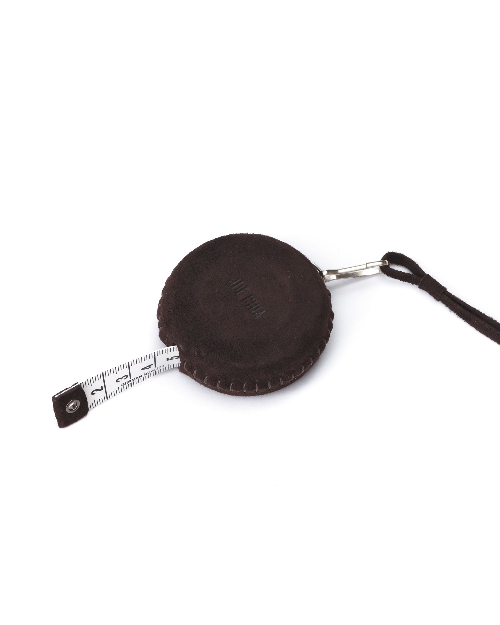 RETRACTABLE MEASURING TAPE WITH LEATHER CASING AND STRAP. FEATURES AND ENGRAVED JOE CHIA LOGO AND AN ADJUSTABLE LEATHER NECK STRAP FOR EASE OF WEAR.