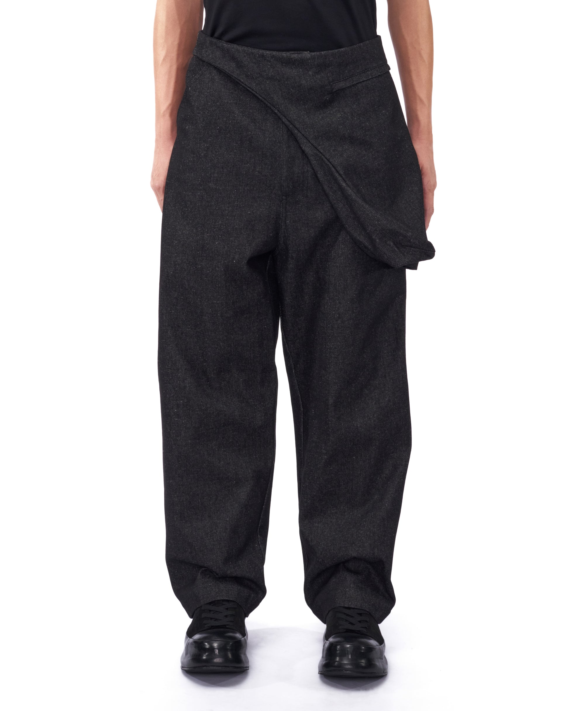 STRAIGHT-CUT PANTS IN STRUCTURED DENIM, FEATURING A DECONSTRUCTED 3D DRAPED POCKET ON THE LEFT LEG WITH A ZIP OPENING. FINISHED WITH A SINGLE BACK WELT POCKET AND A STRUCTURED SILHOUETTE.