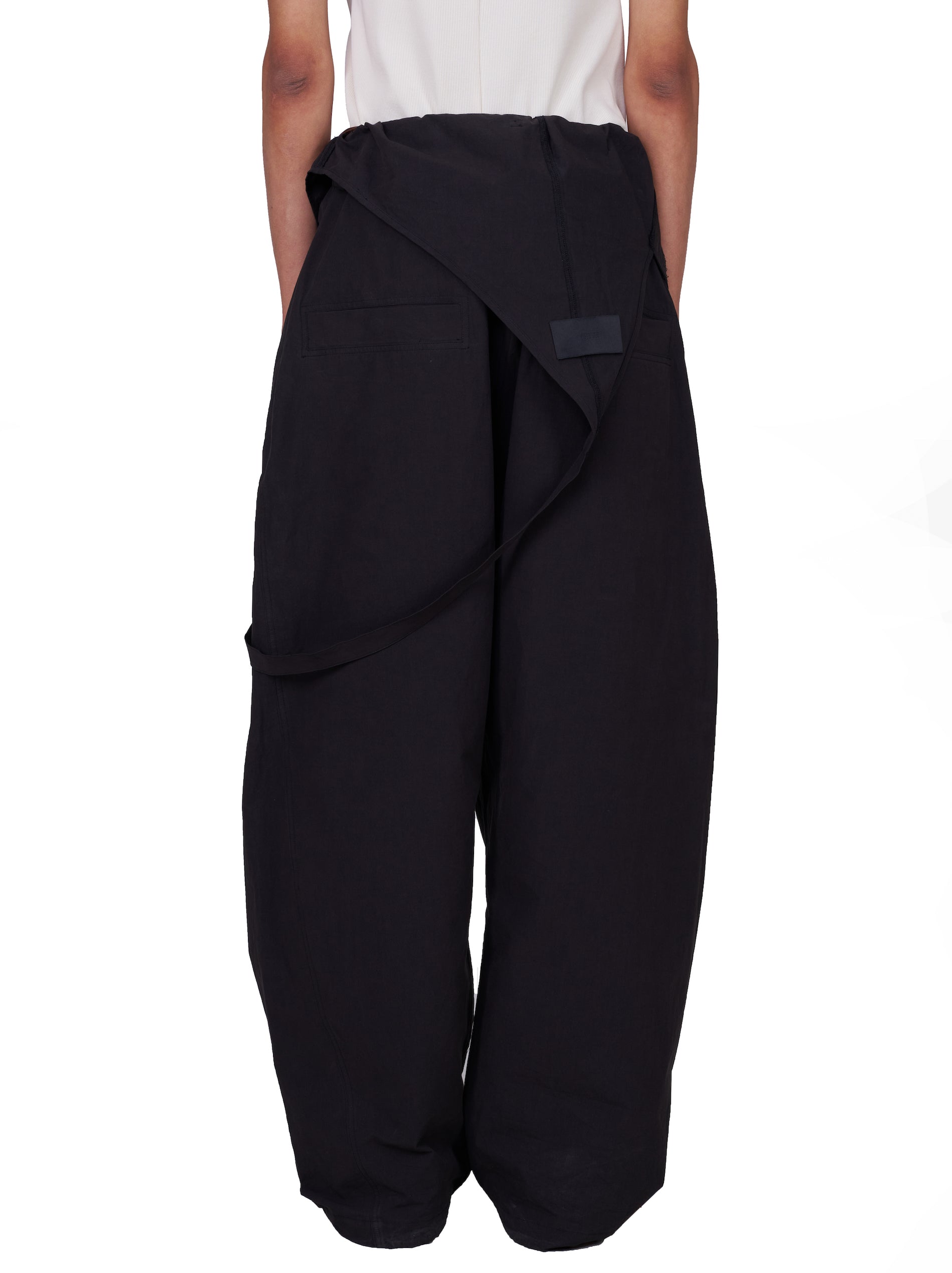FASTEN BELT ACROSS WAIST ALONG LOOPS TO WEAR AS  TROUSERS. REVEALED BUTTON CLOSURE AND AN ADJUSTABLE SHOULDER STRAP.